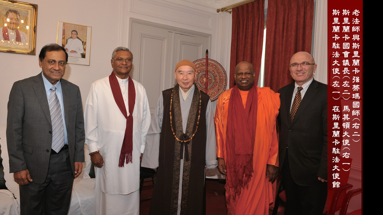 老法師與斯里蘭卡強帝瑪國師、斯里蘭卡國會議長、馬其頓大使、斯里蘭卡駐法大使在斯里蘭卡駐法大使館