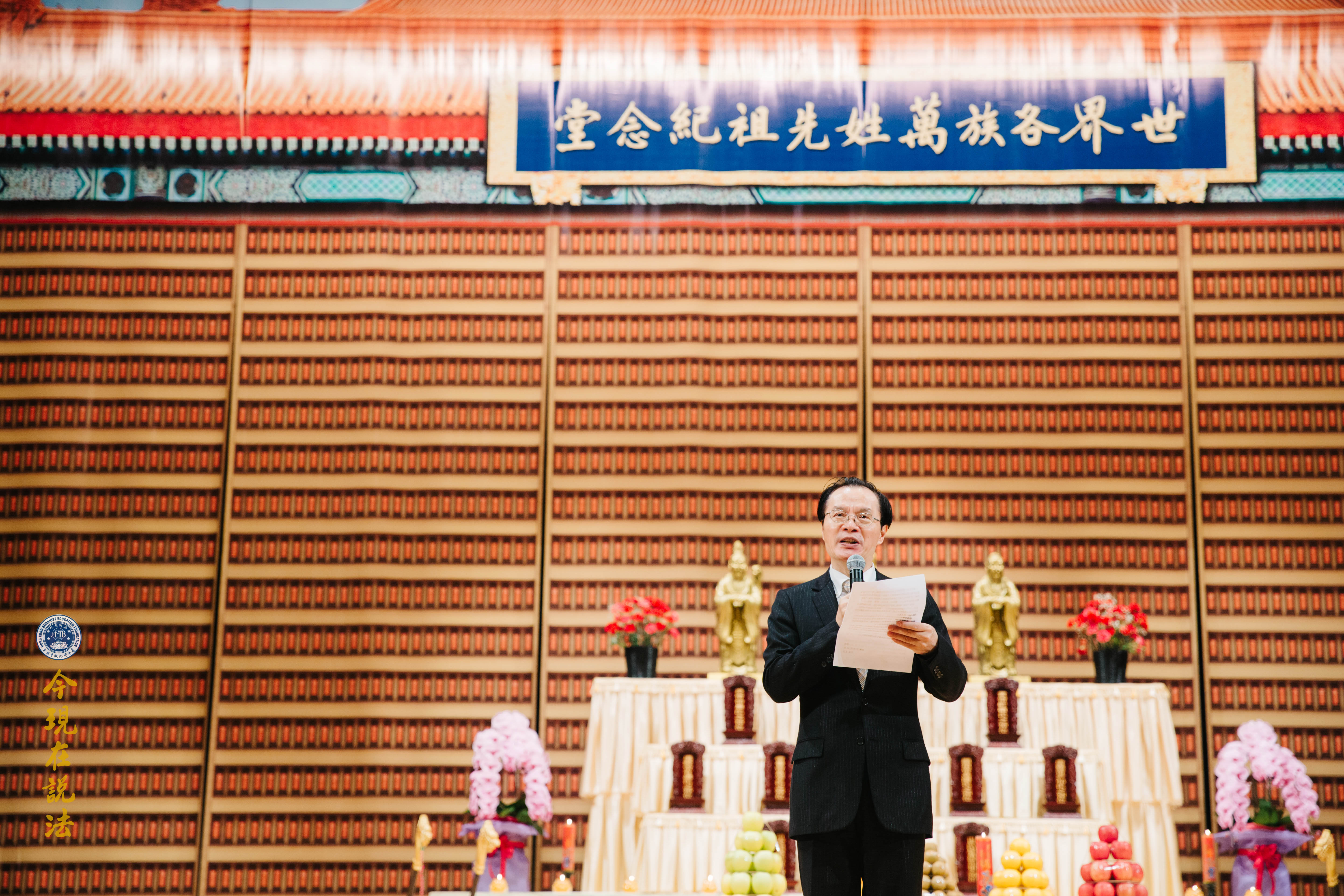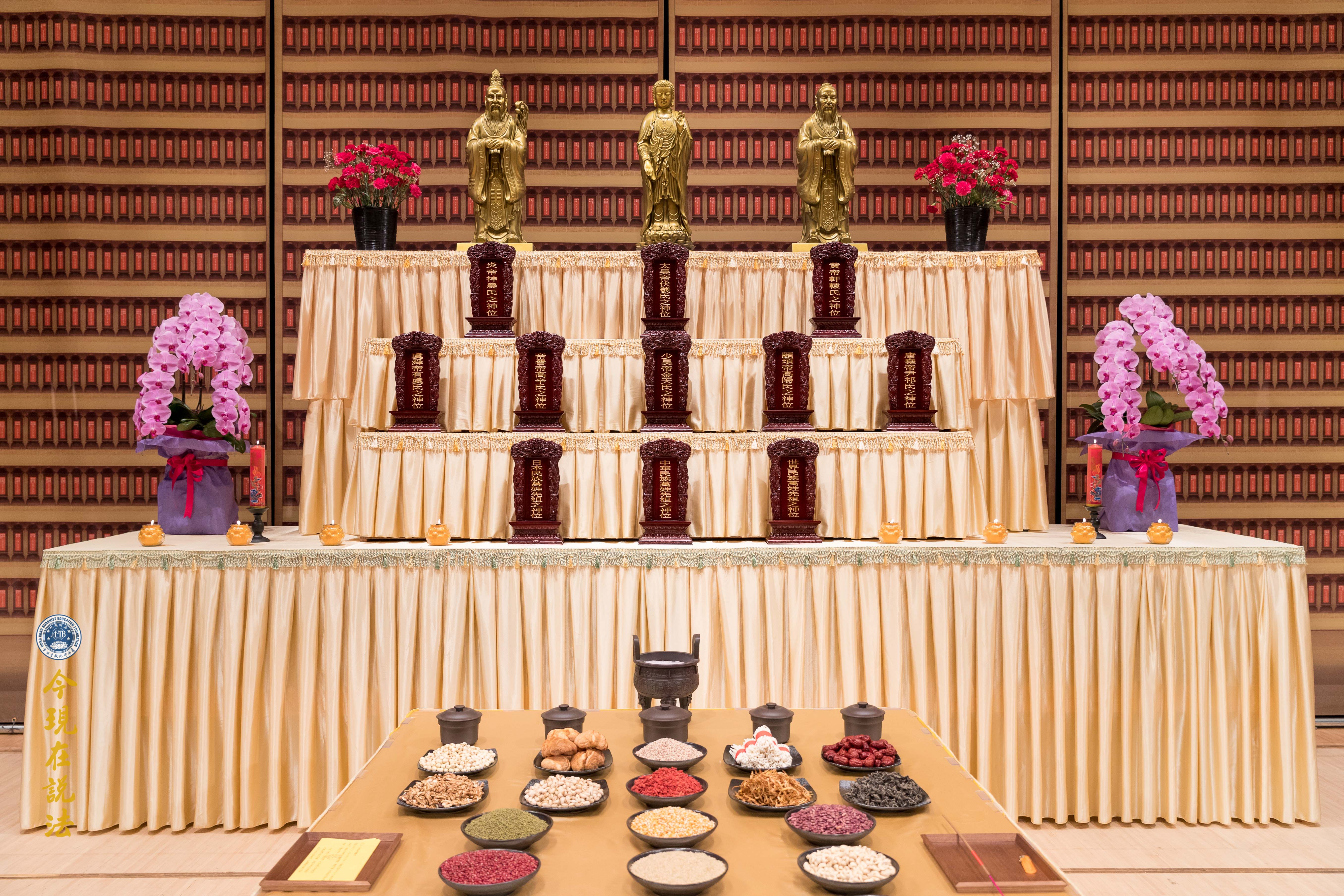 祭壇上供奉儒釋道三聖聖像及世界各族萬姓先祖牌位