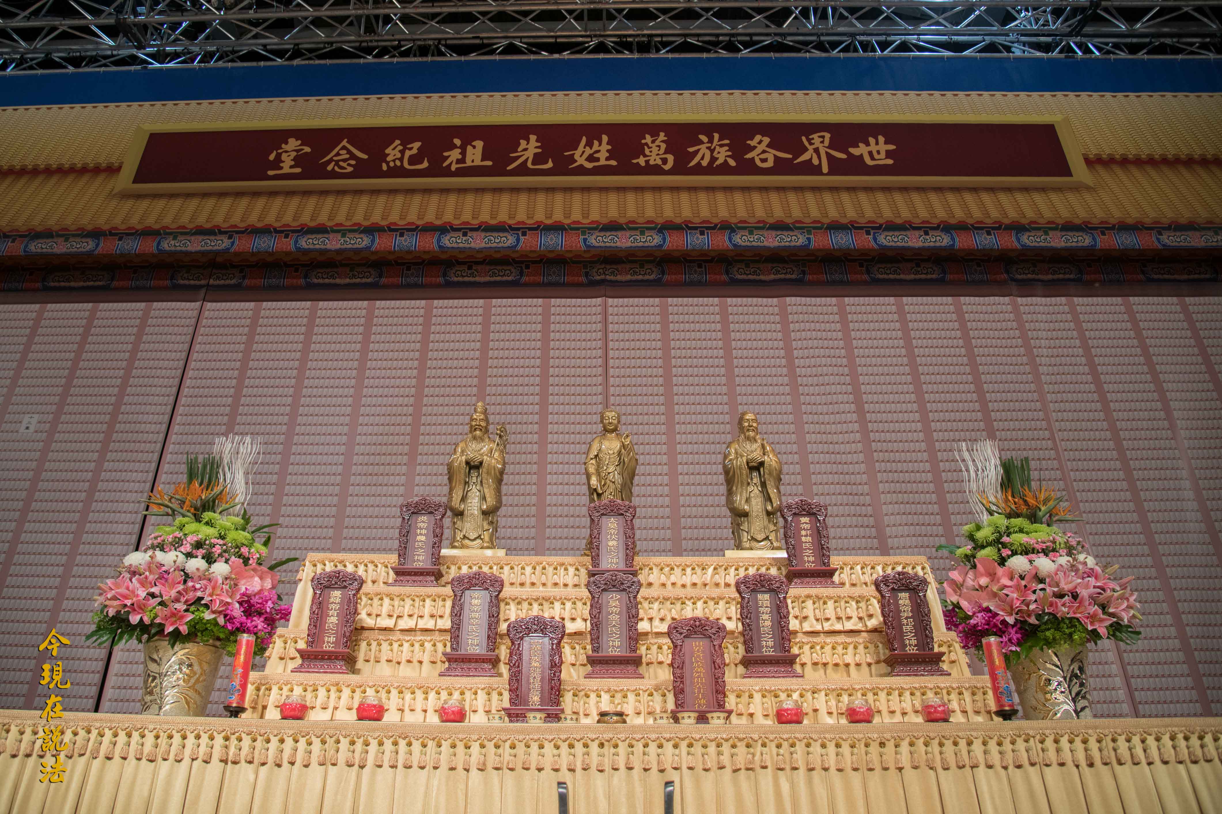 祭壇上供奉儒釋道三聖銅像及世界各族萬姓先祖牌位