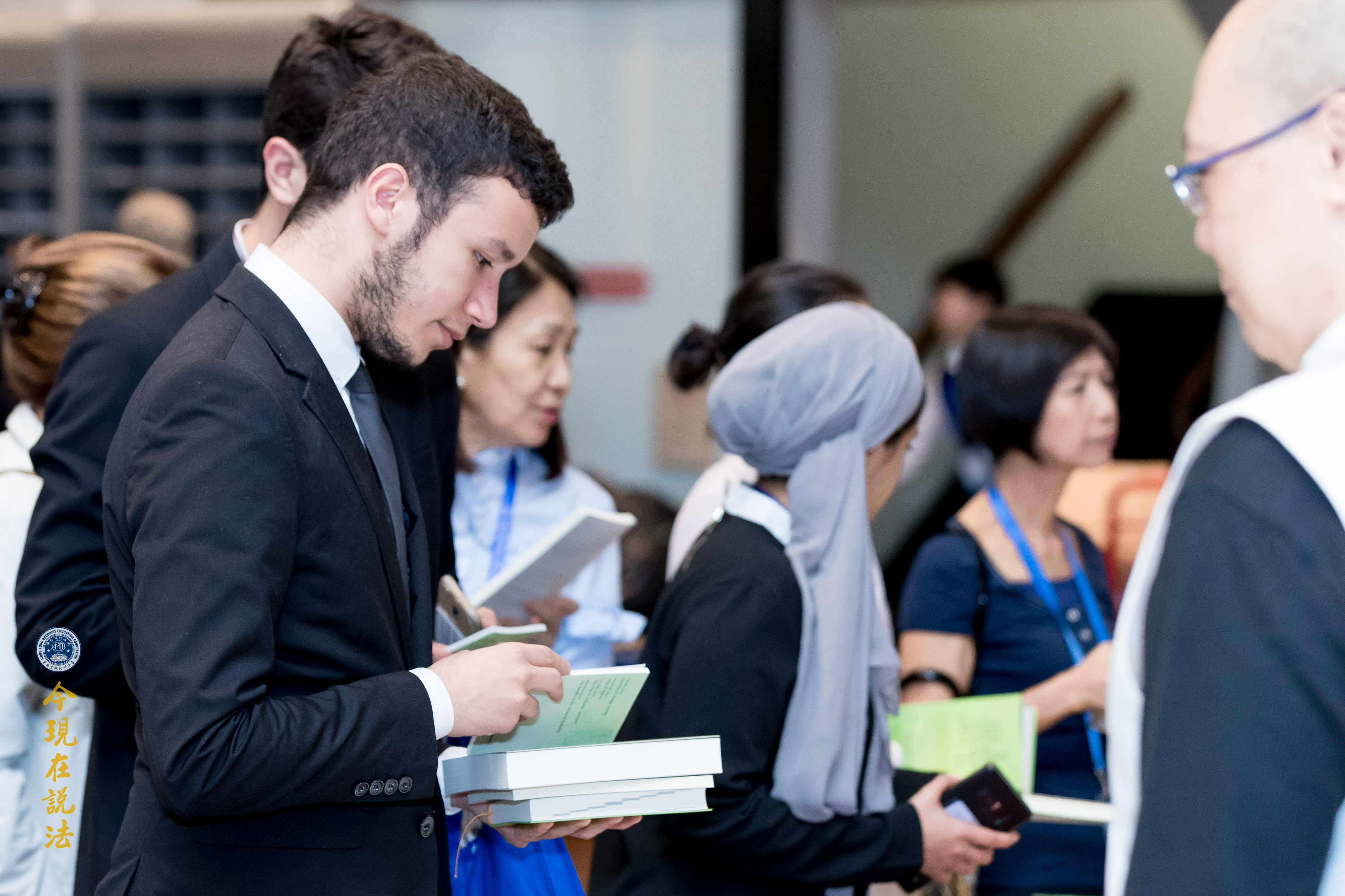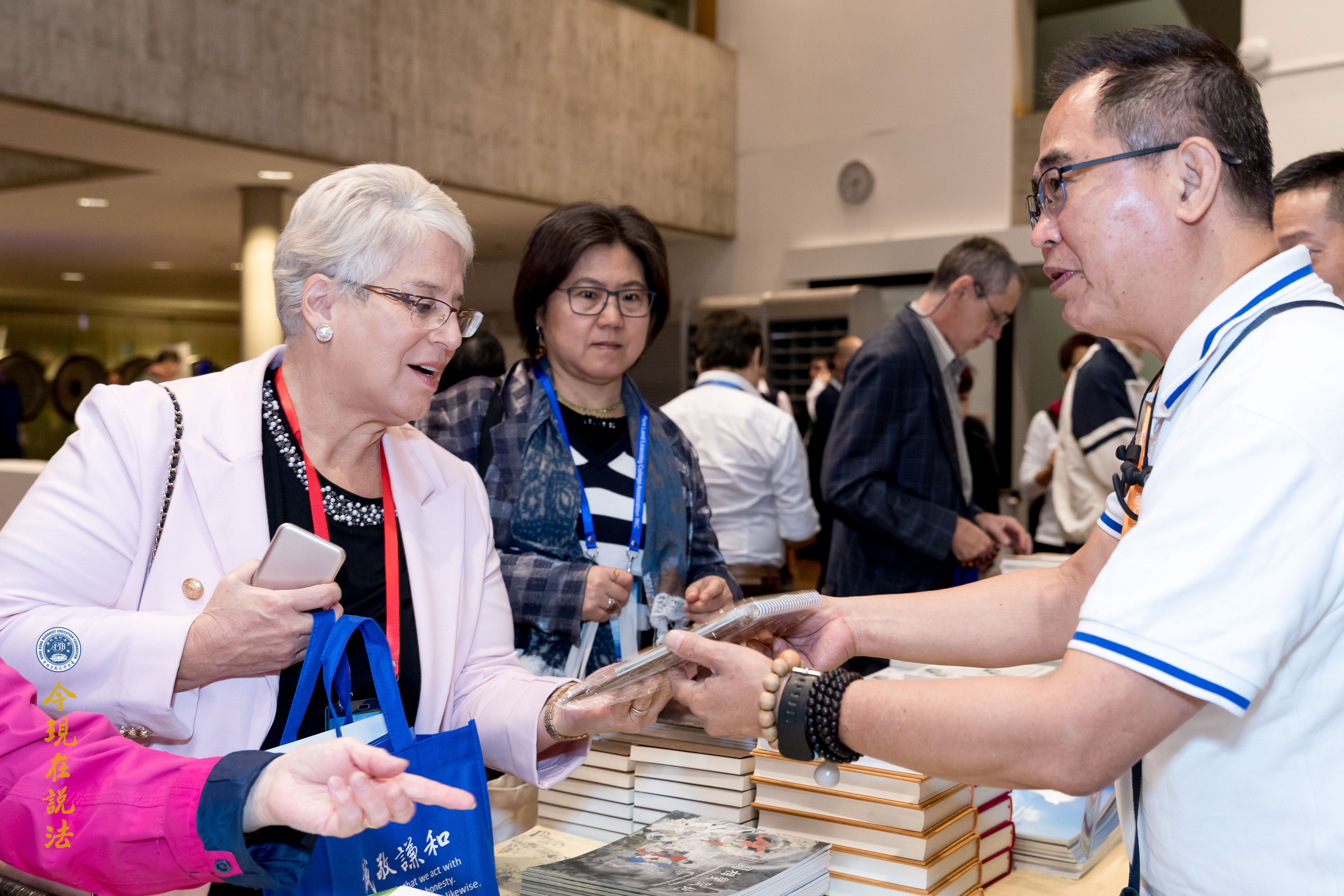 法寶贈閱區:義工熱忱地向與會者介紹各類中、英、法文等法寶。