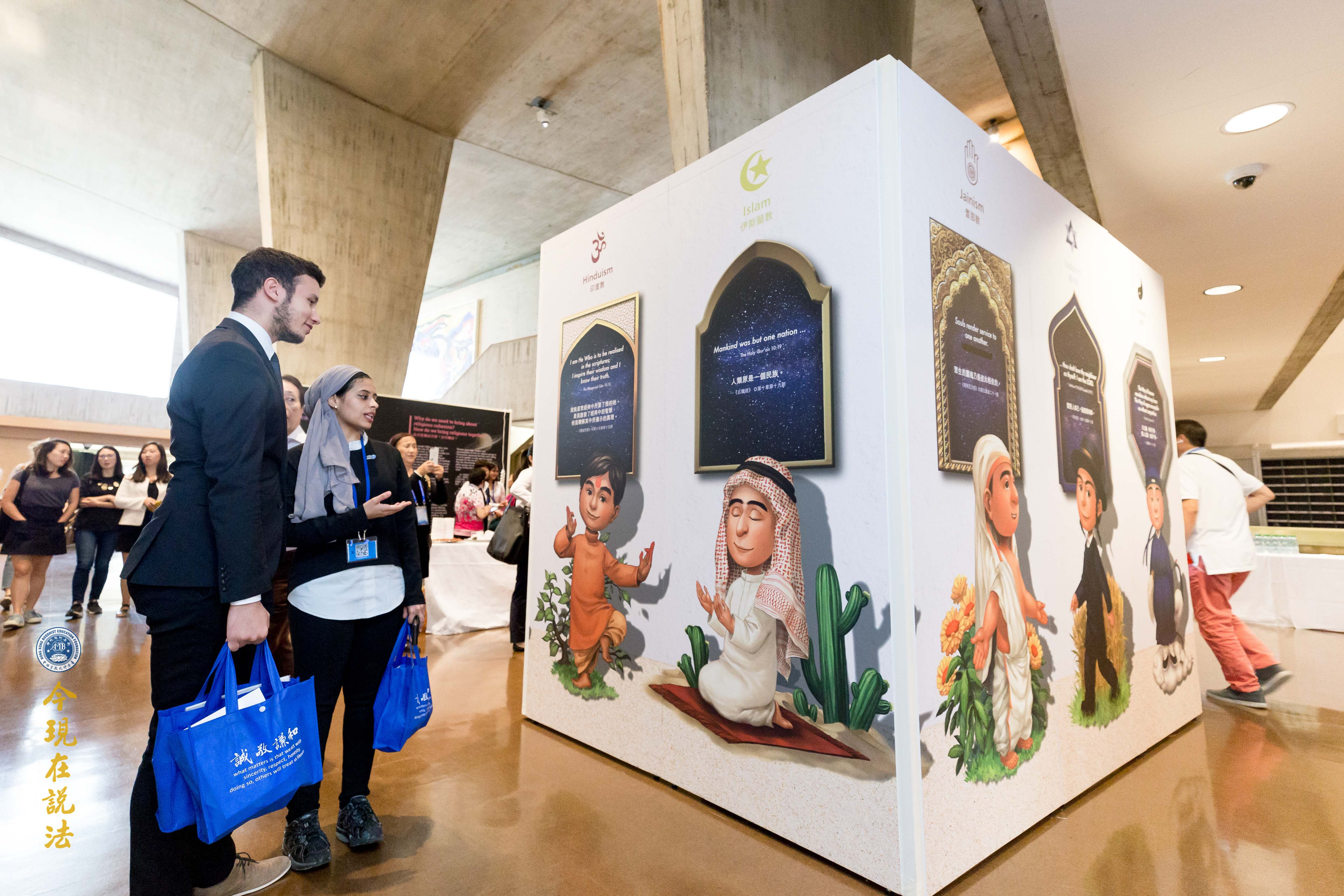 會場展示十大宗教關於「神愛世人」「一體」的精華經句展板。