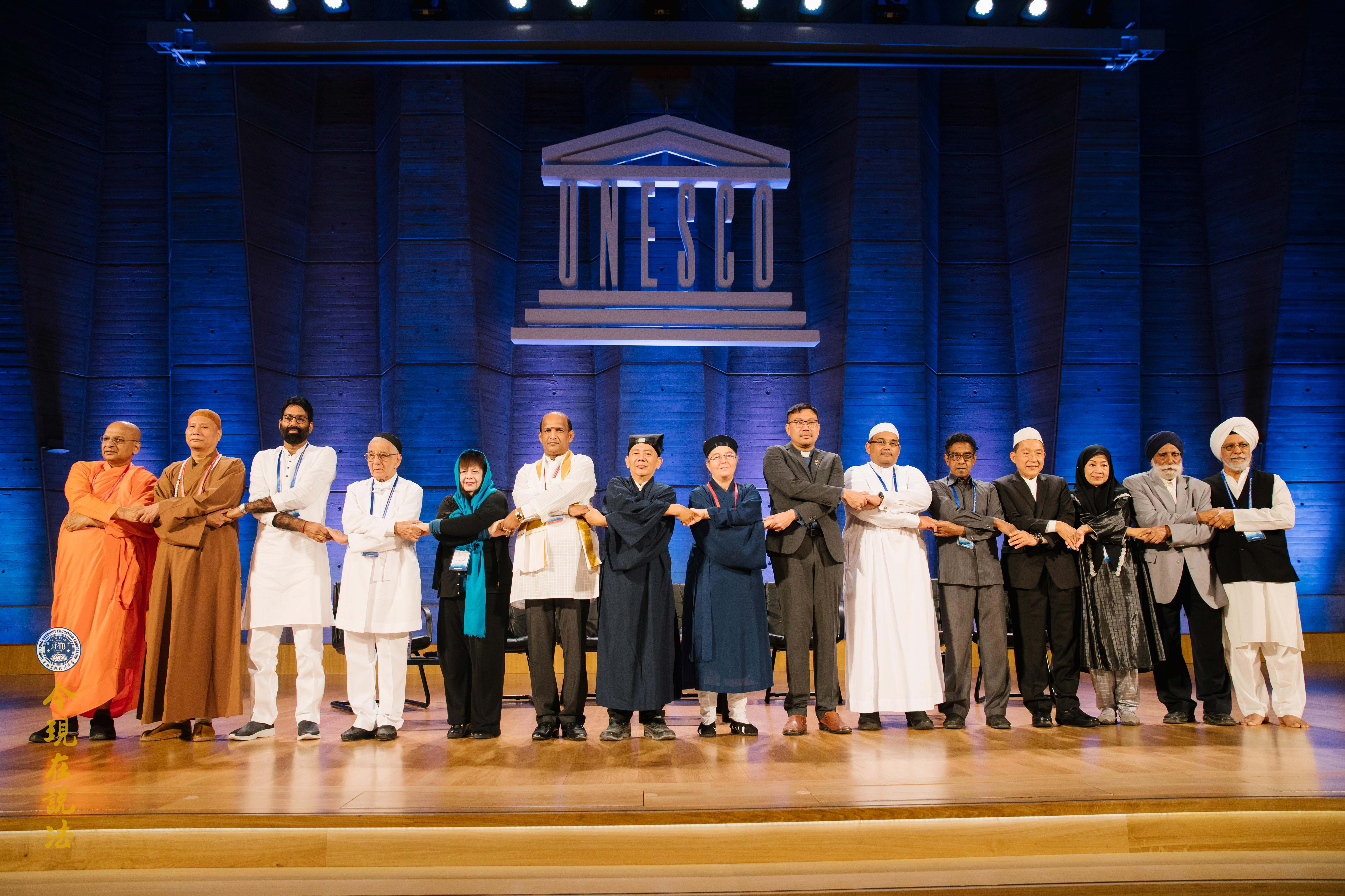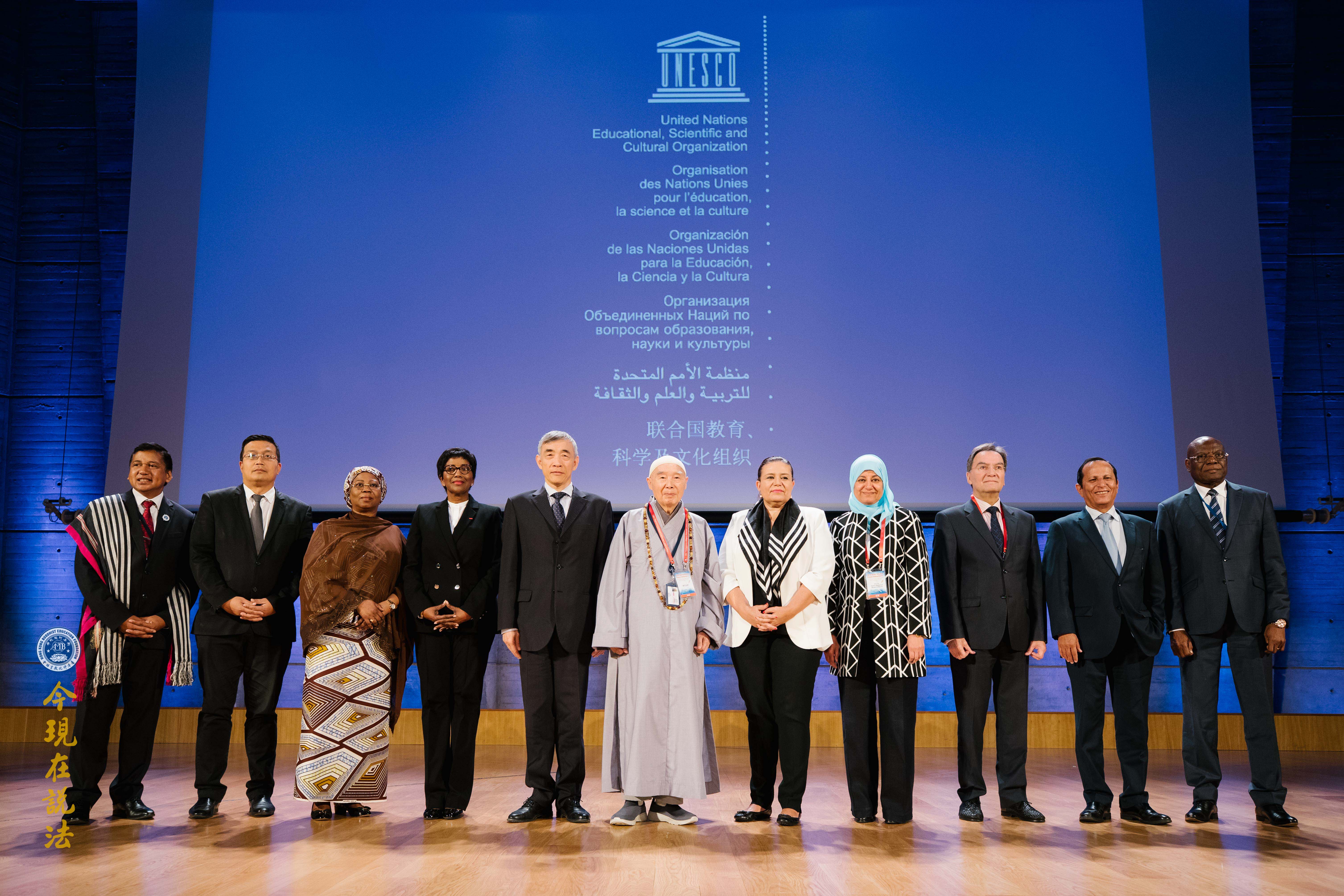 9月17日,2018國際和平大會於聯合國教科文組織總部舉辦,淨空之友社永久榮譽主席淨空老法師與教科文大會主席、副總幹事、主辦方、協辦方大使等嘉賓合影