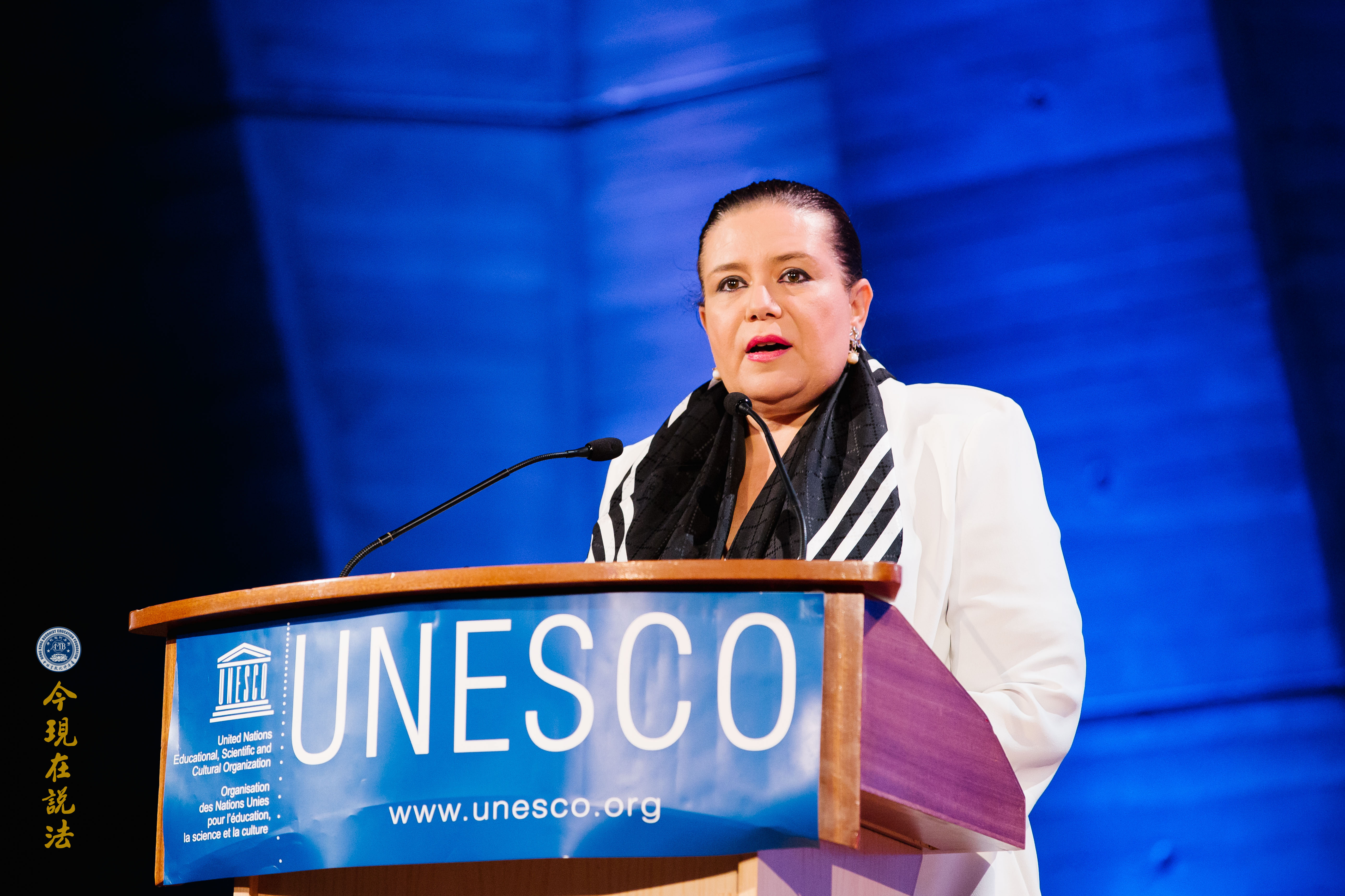 教科文組織大會主席阿羅伊閣下致開幕辭,強調本屆大會所探討的主題「多元文化與多元宗教對話及教育促進世界和平、和諧與寬容」意義重大;閣下在致辭時表示,她相信「寬容是一種美德,讓和平成為可能」。