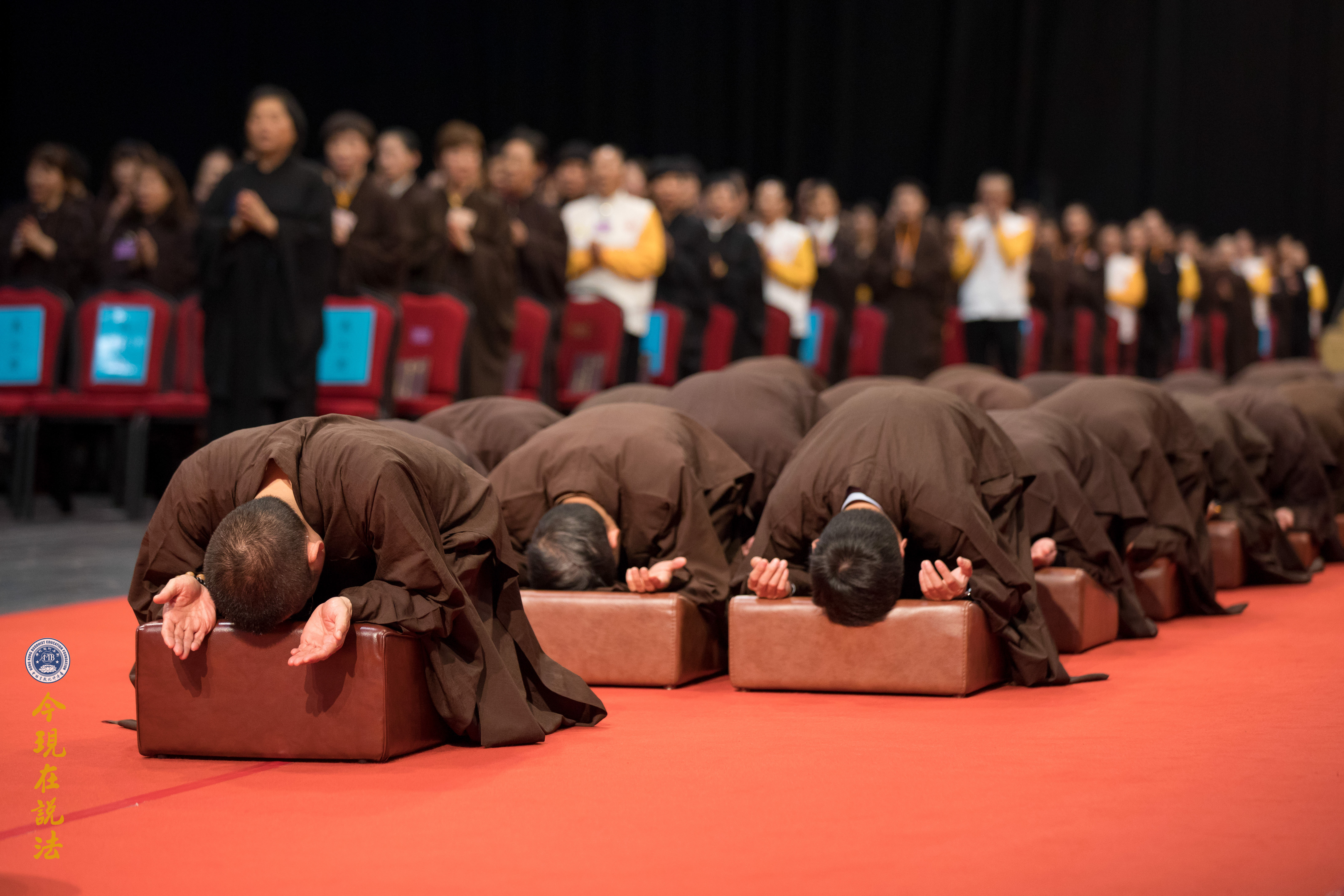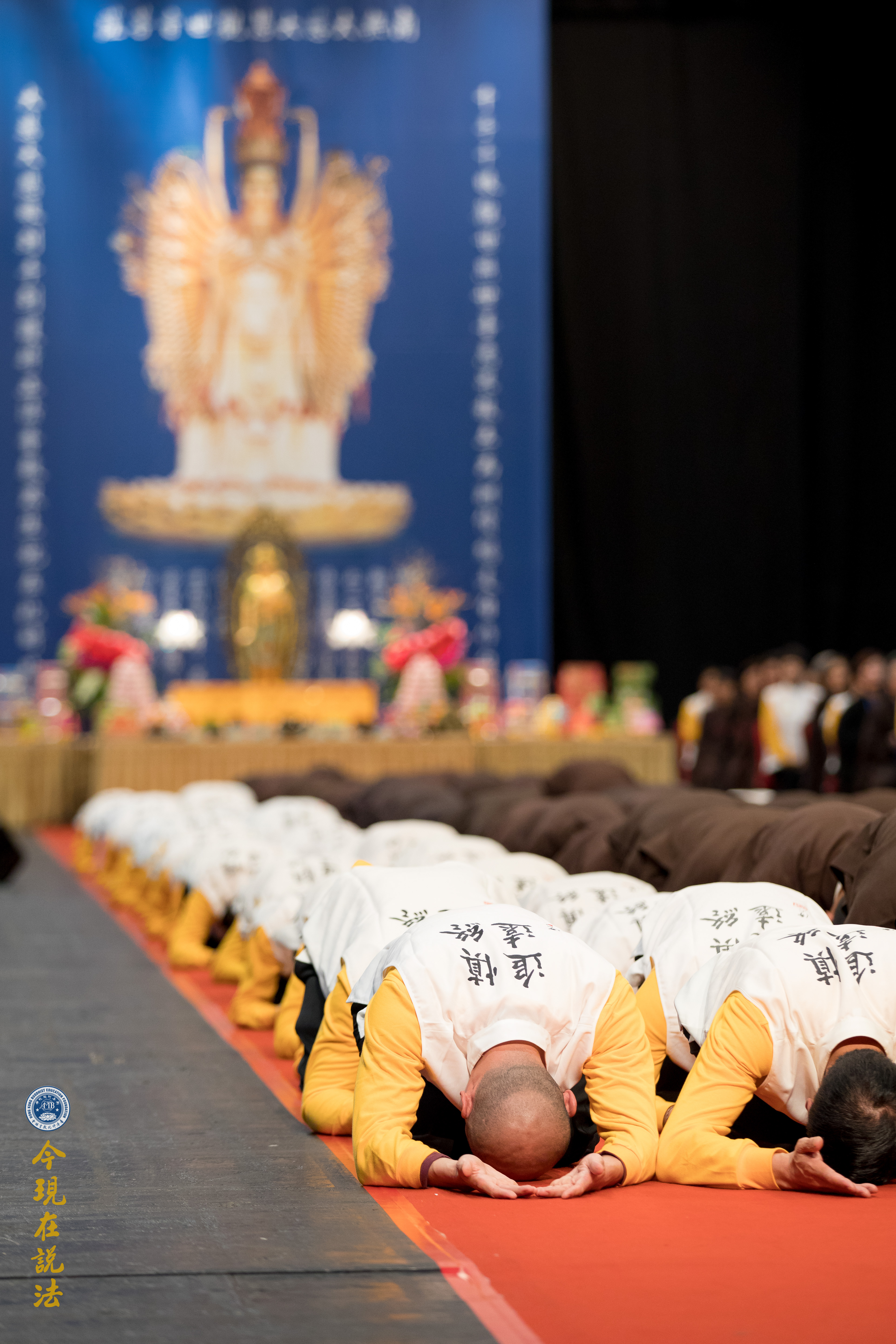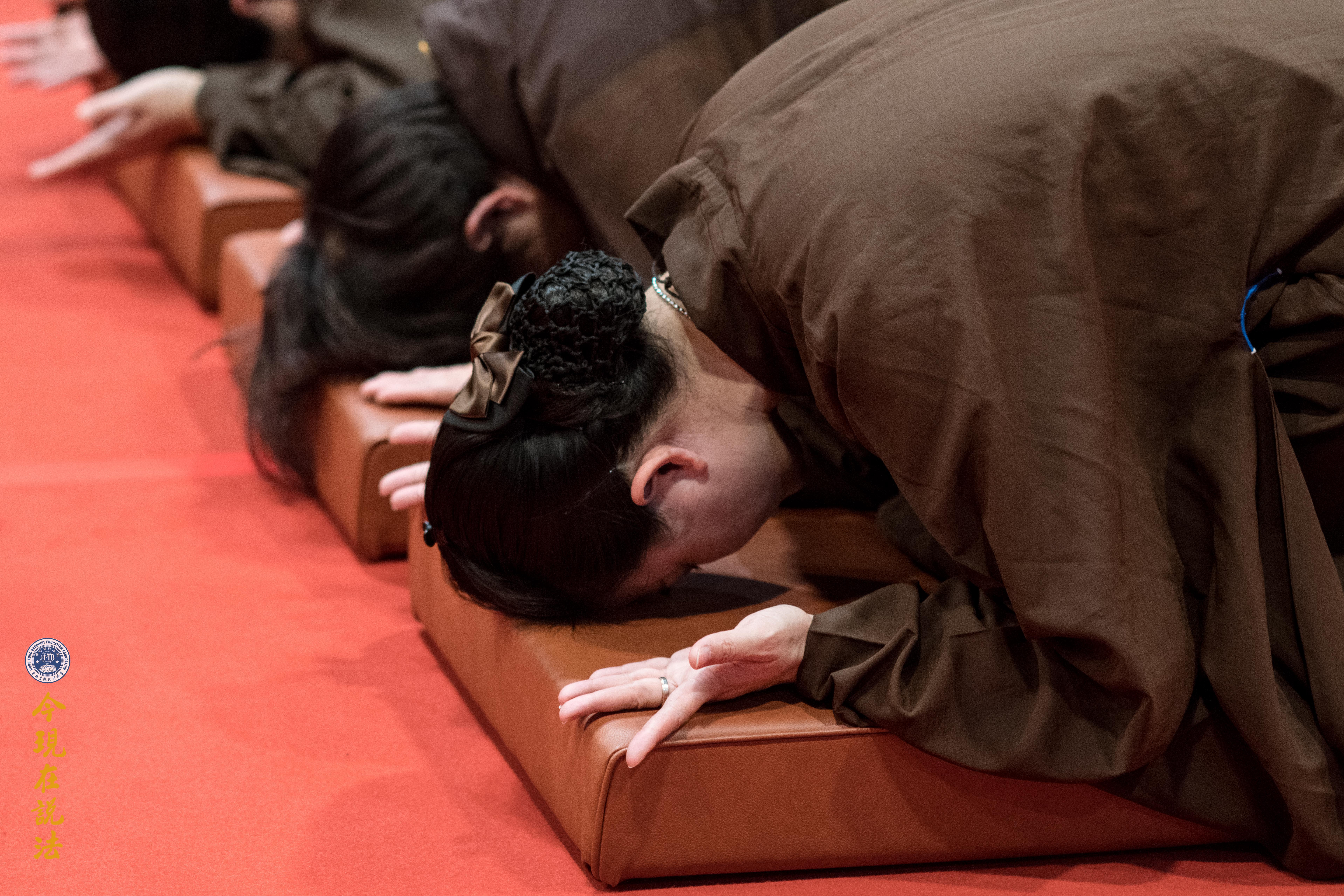 【懺悔】懺悔代表代眾懺悔,聽引禮號令叩拜。眾生無始劫來,一念迷失,六根逐妄,身口意隨欲造惡,由此長淪六道;若想出離,唯有依憑真心懺悔的加持力,消除罪業,六根轉淨。