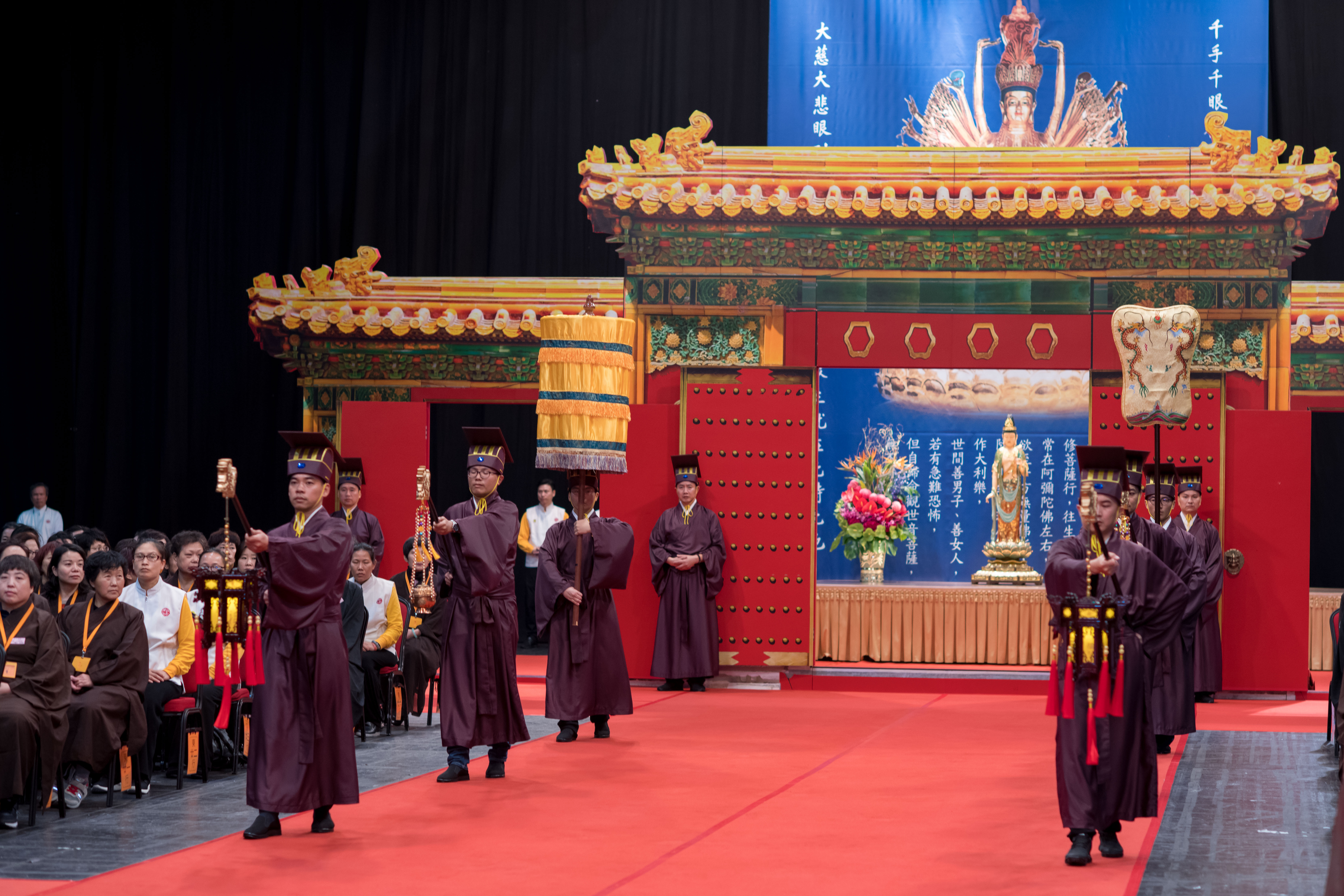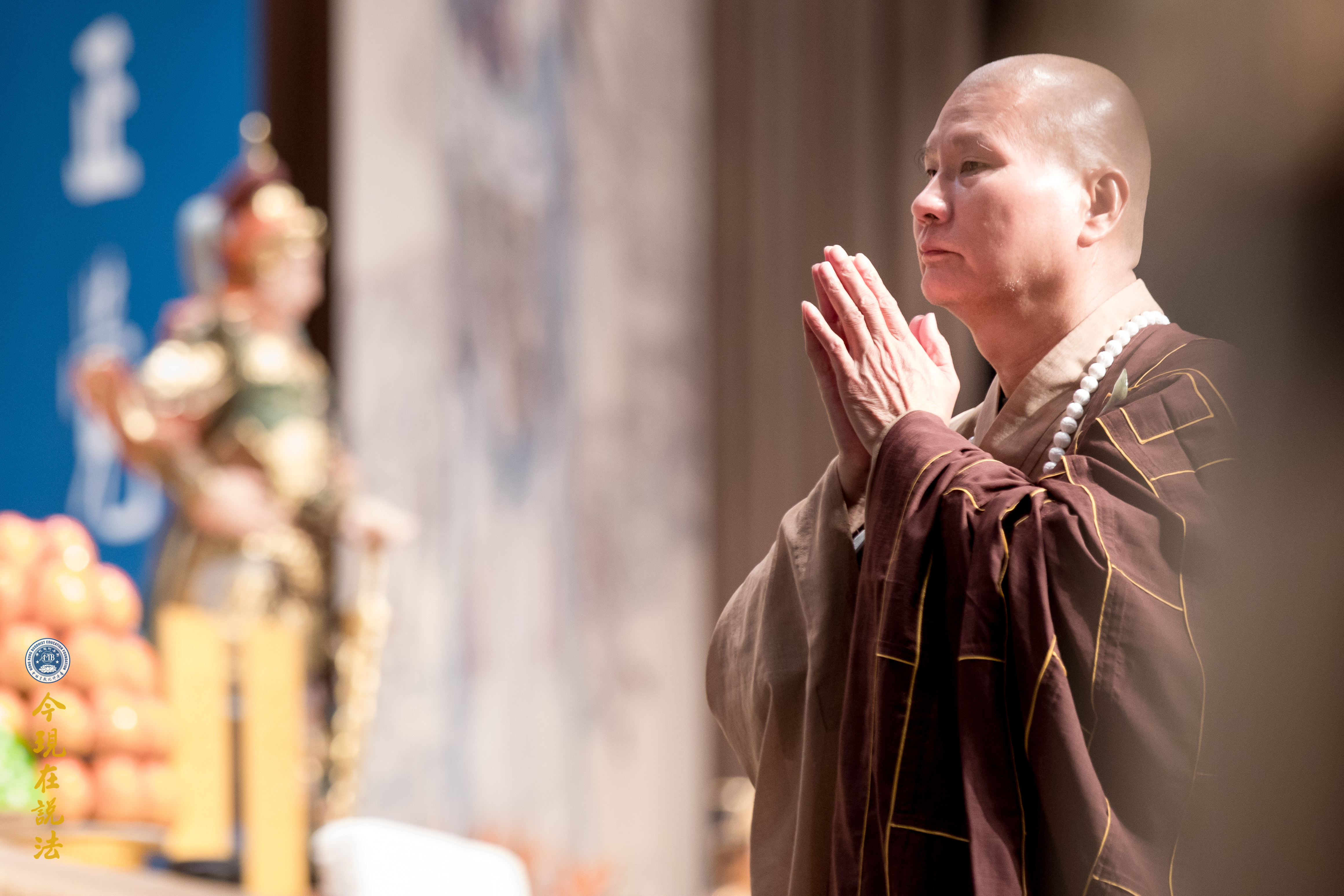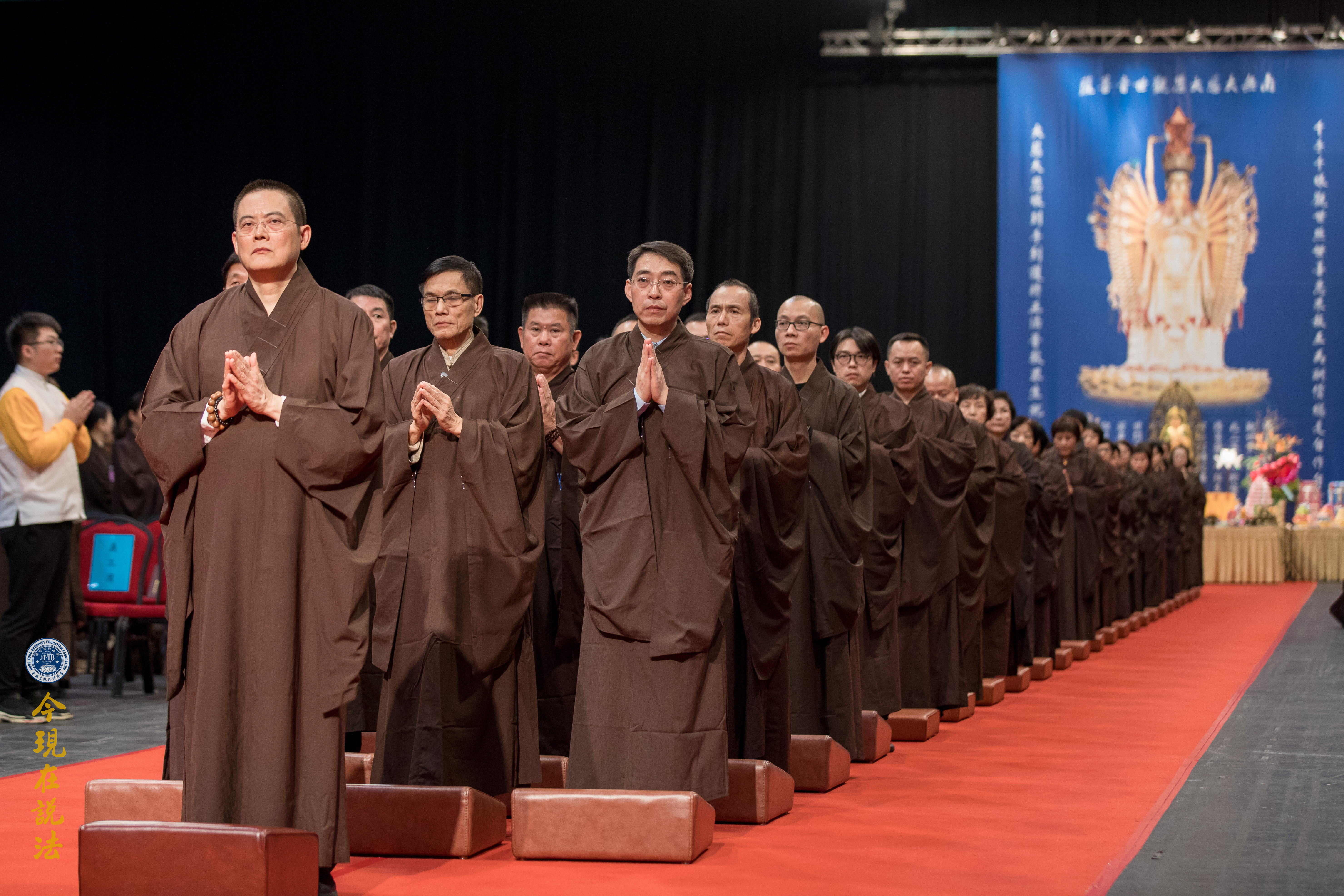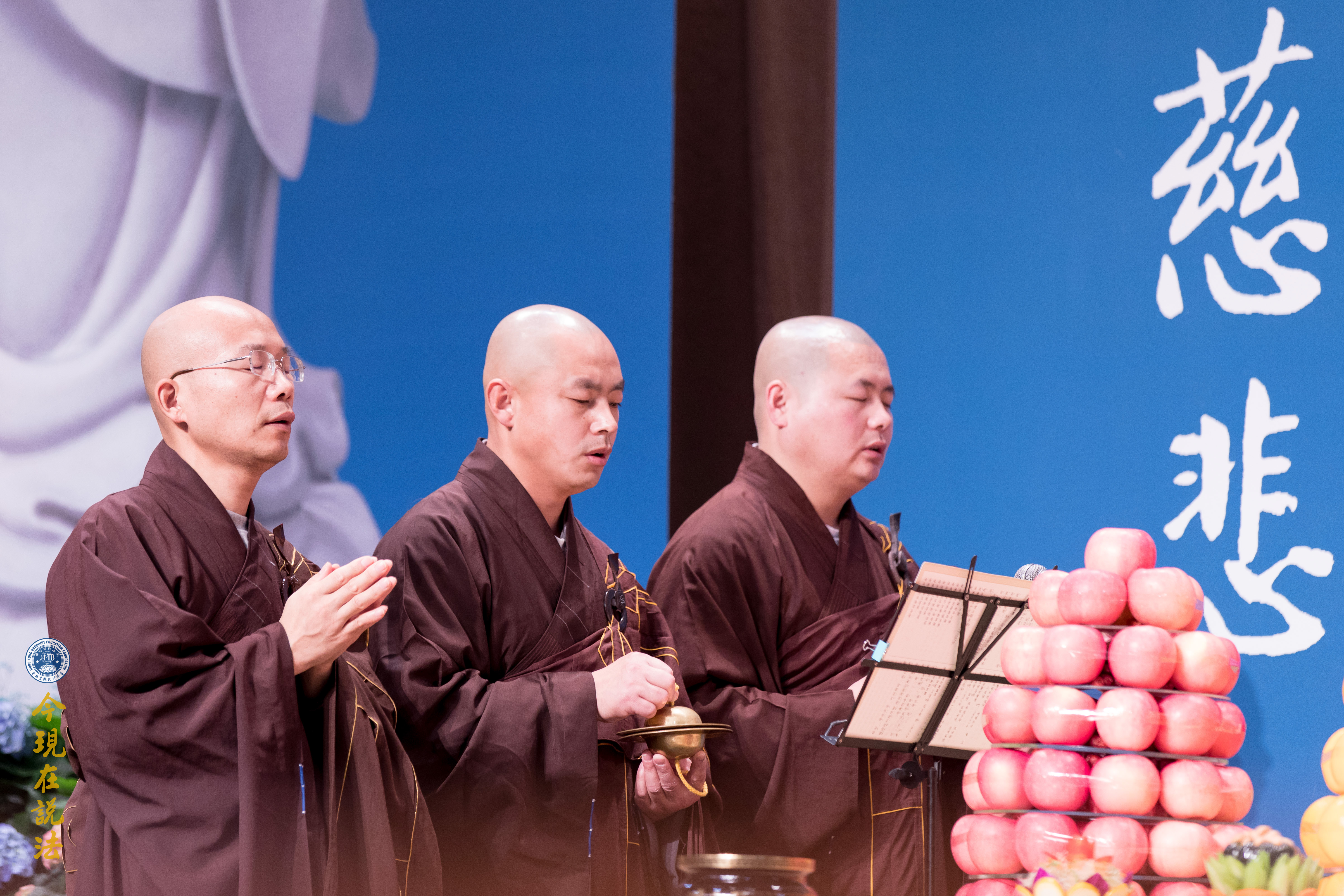 【懺悔】懺悔代表代眾懺悔,聽引禮號令叩拜。眾生無始劫來,一念迷失,六根逐妄,身口意隨欲造惡,由此長淪六道;若想出離,唯有依憑真心懺悔的加持力,消除罪業,六根轉淨。