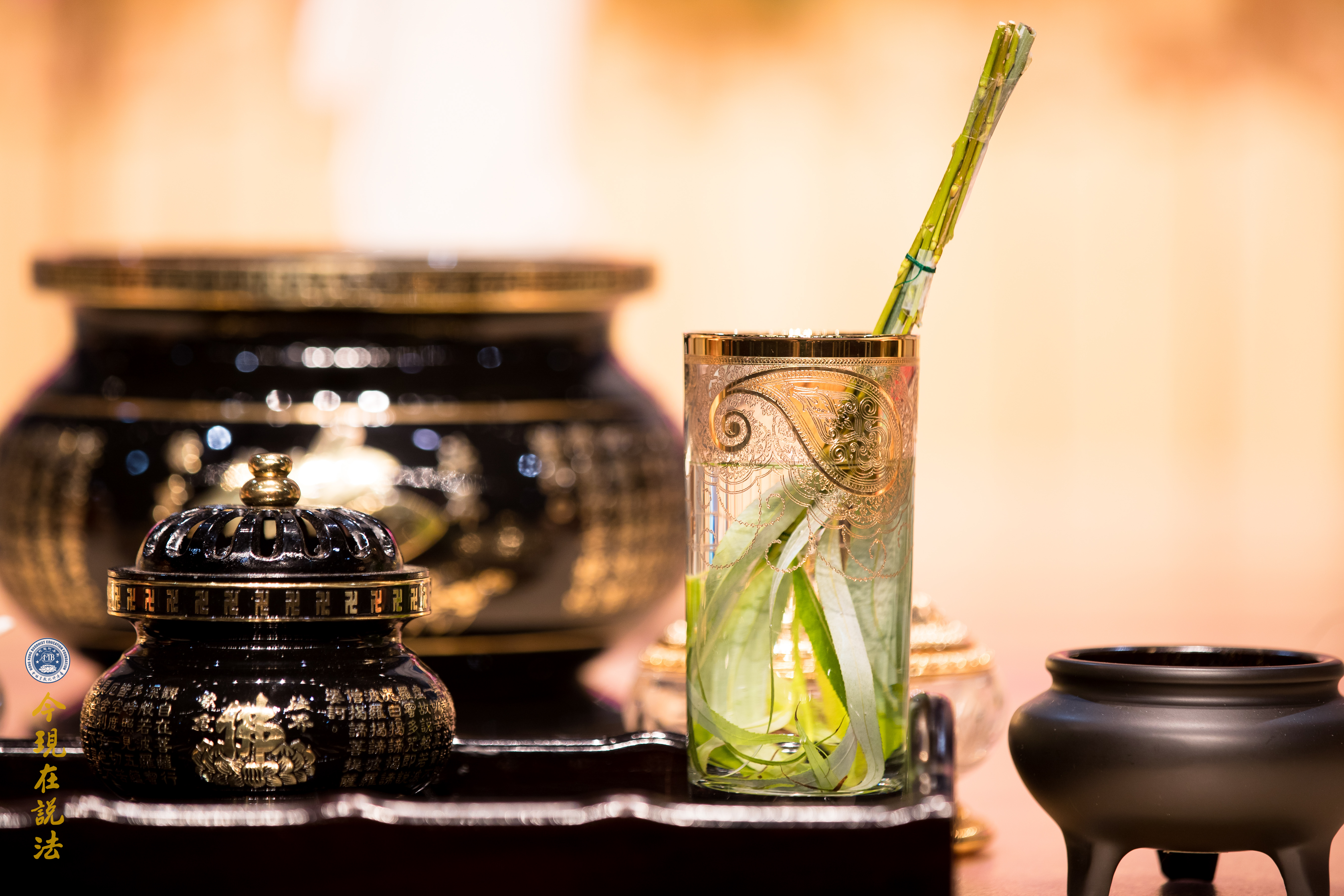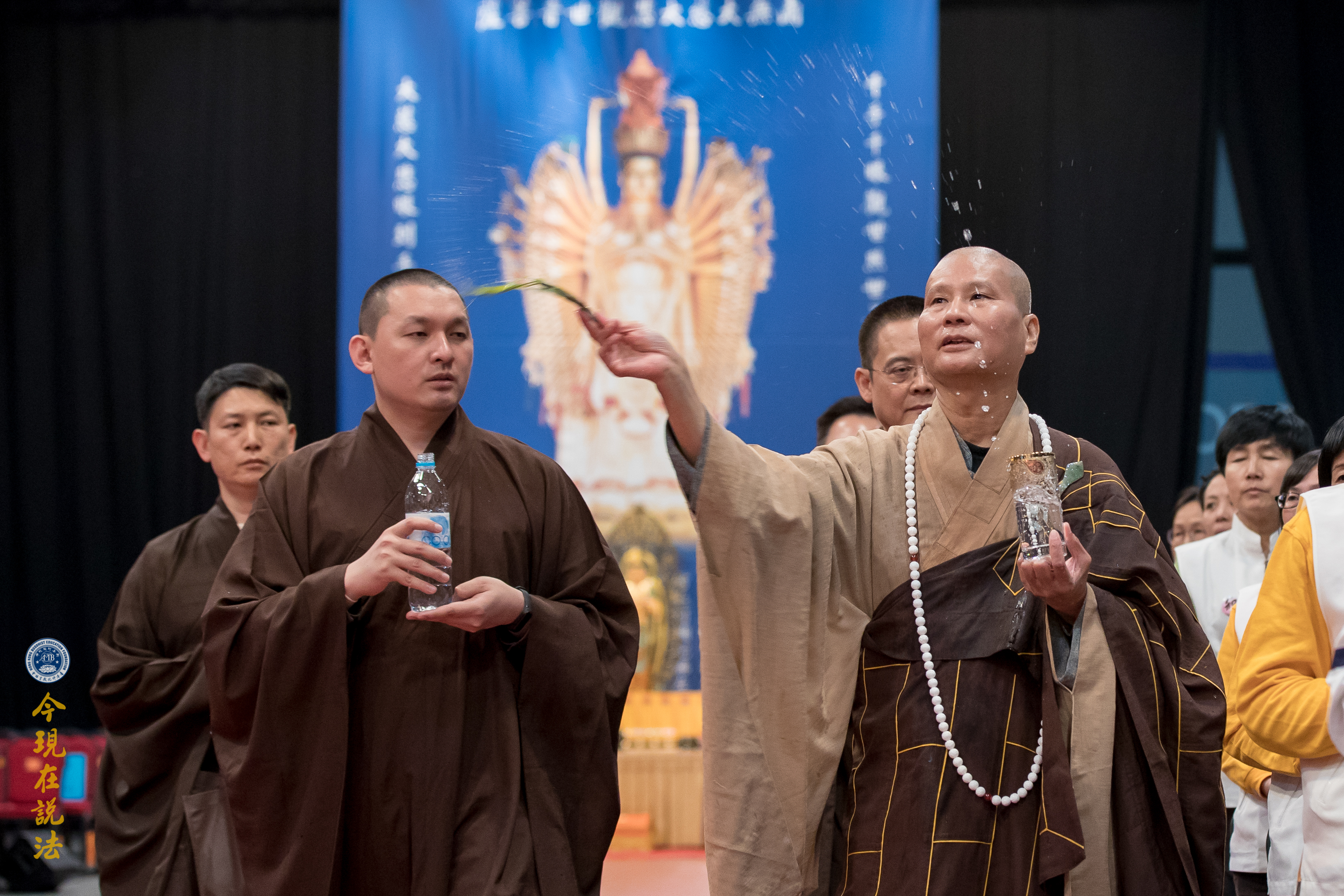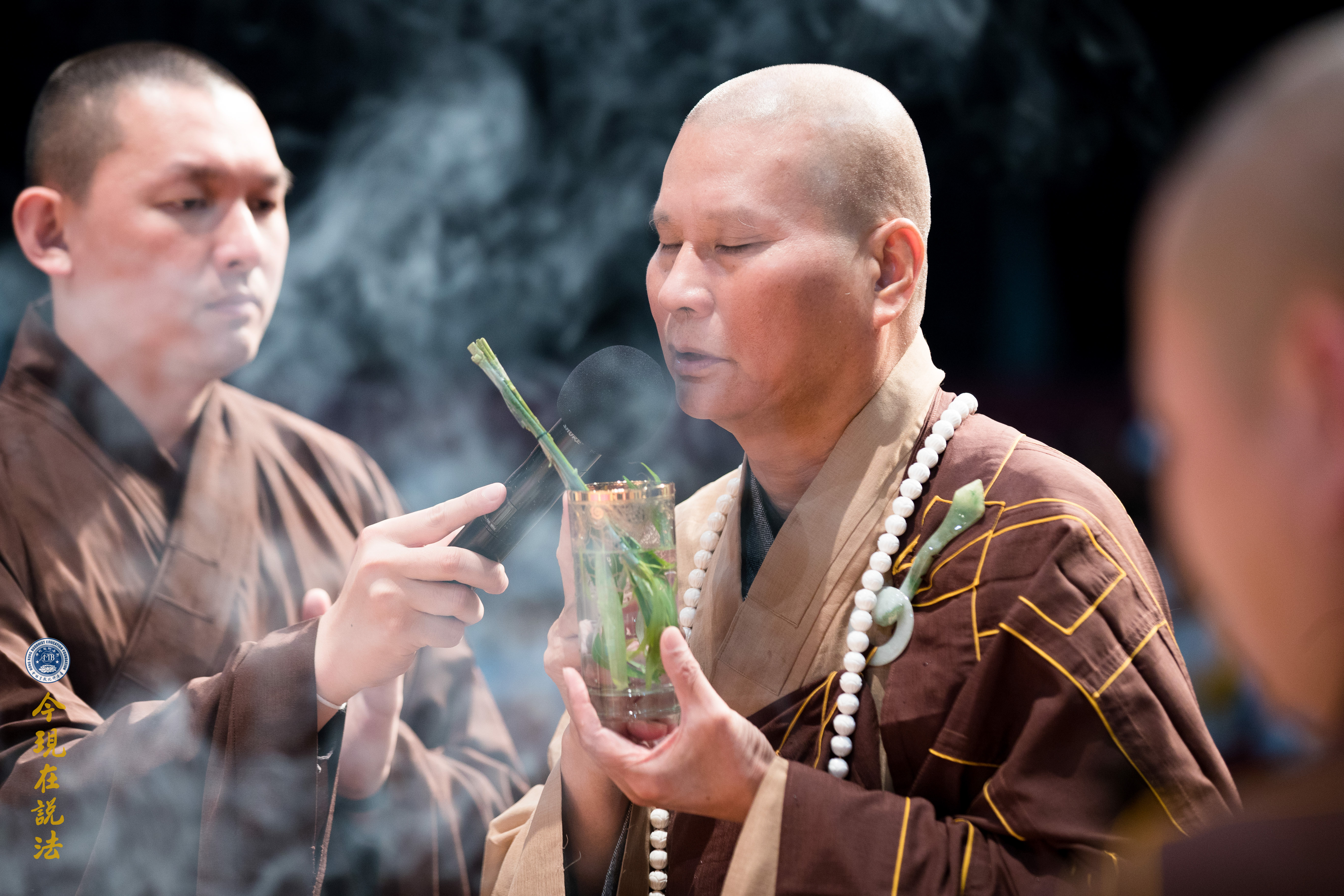 主法和尚持誦大悲神咒,手持淨水瓶以柳枝灑淨水。