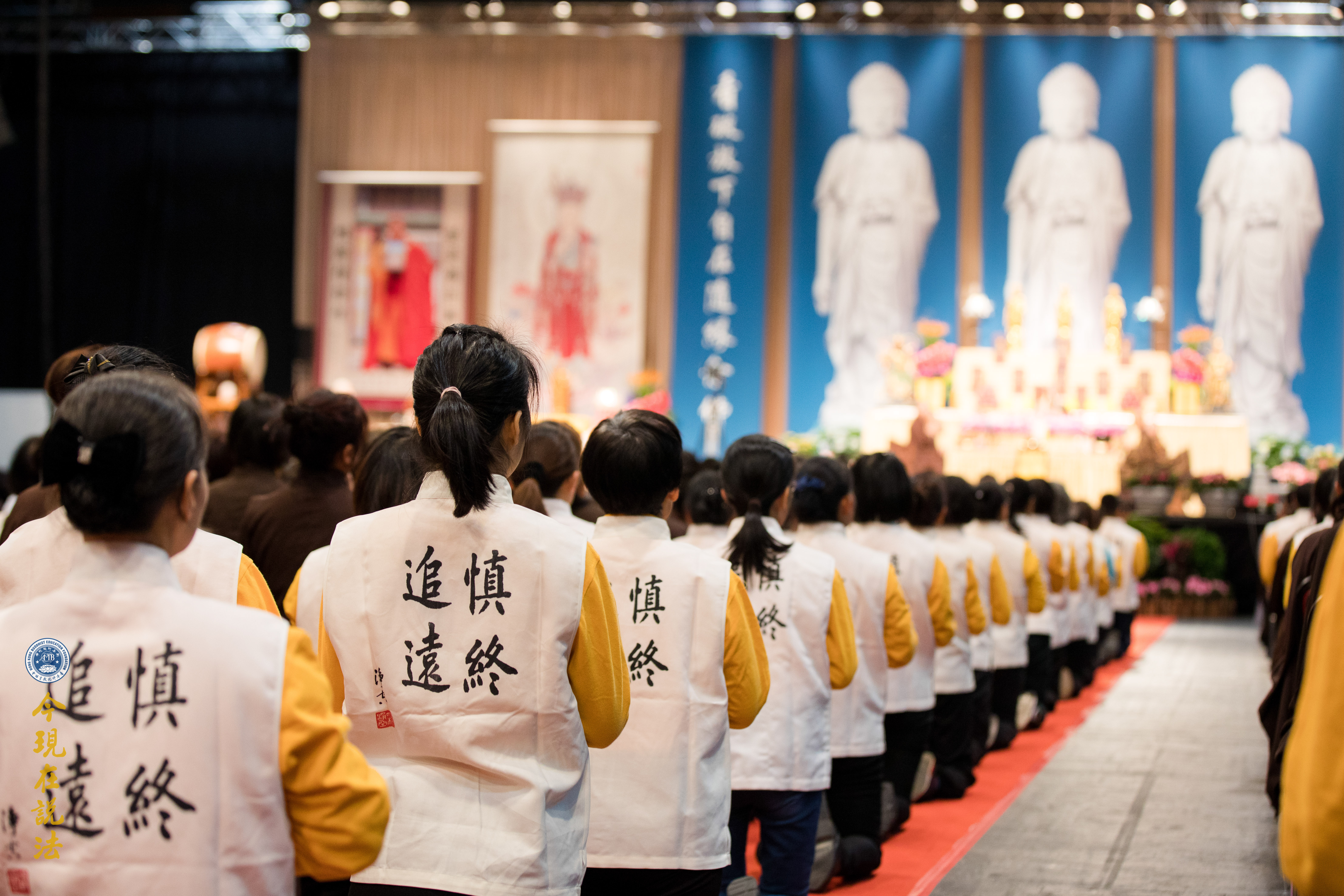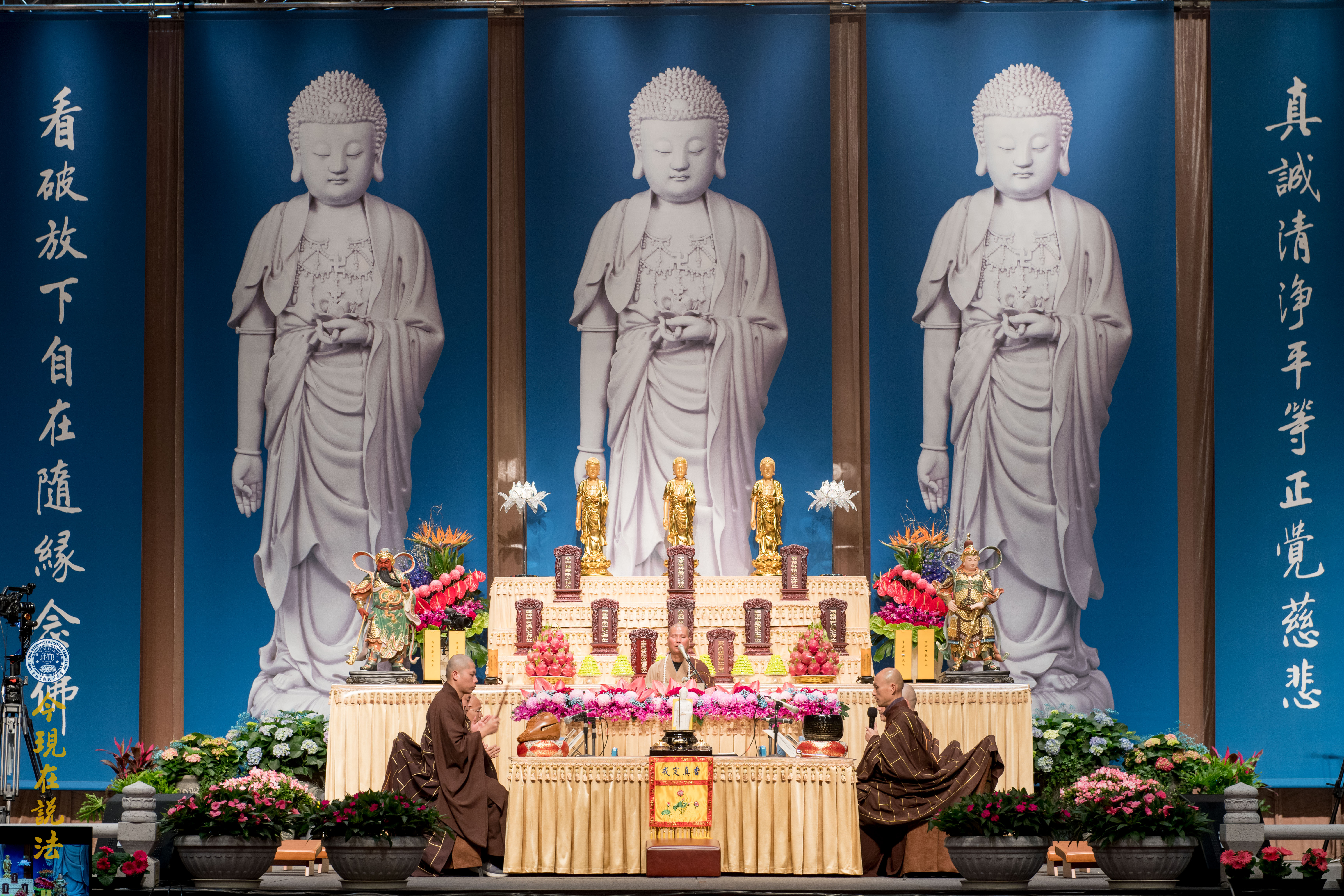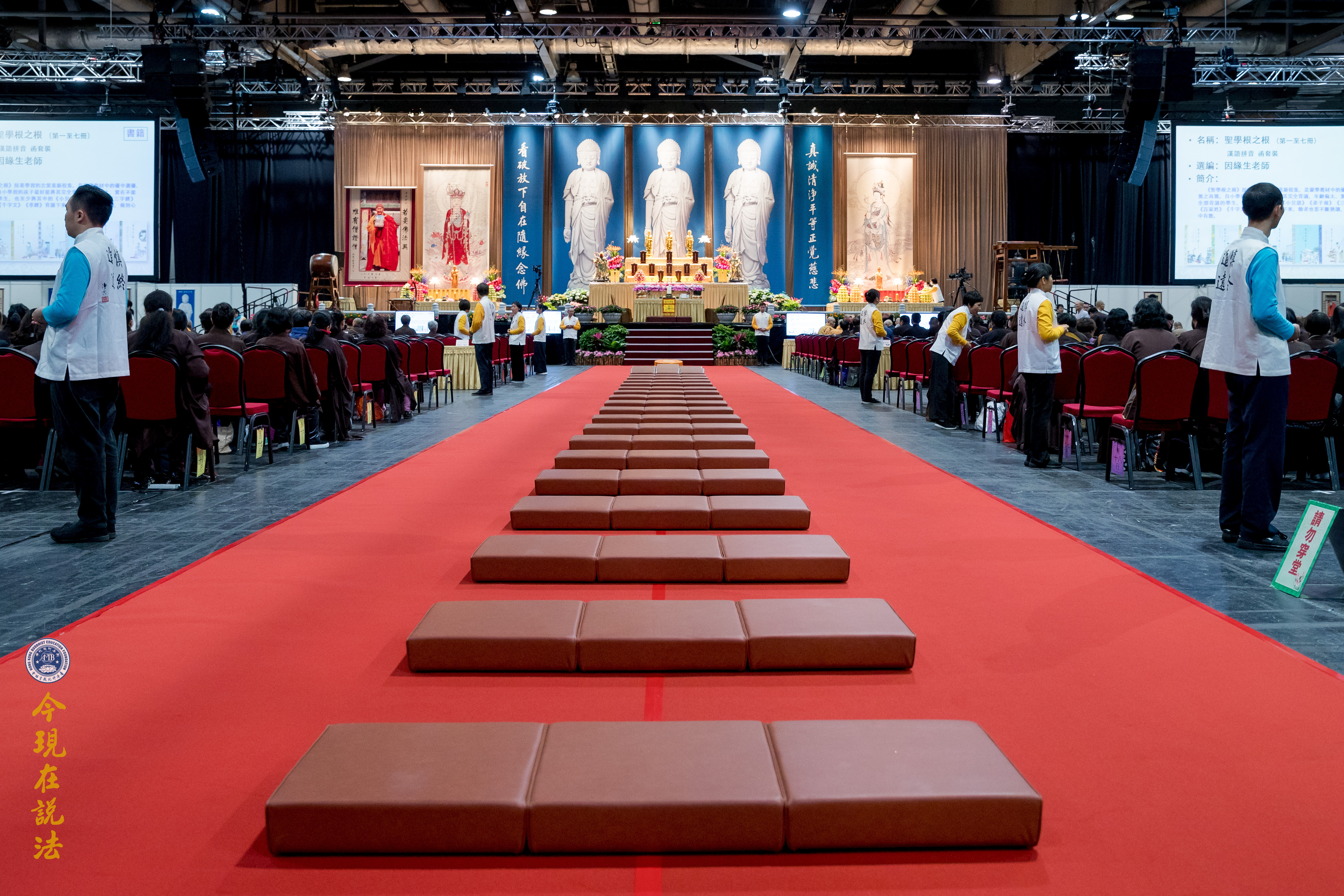 會場懸掛巨幅佛像,莊嚴肅穆。