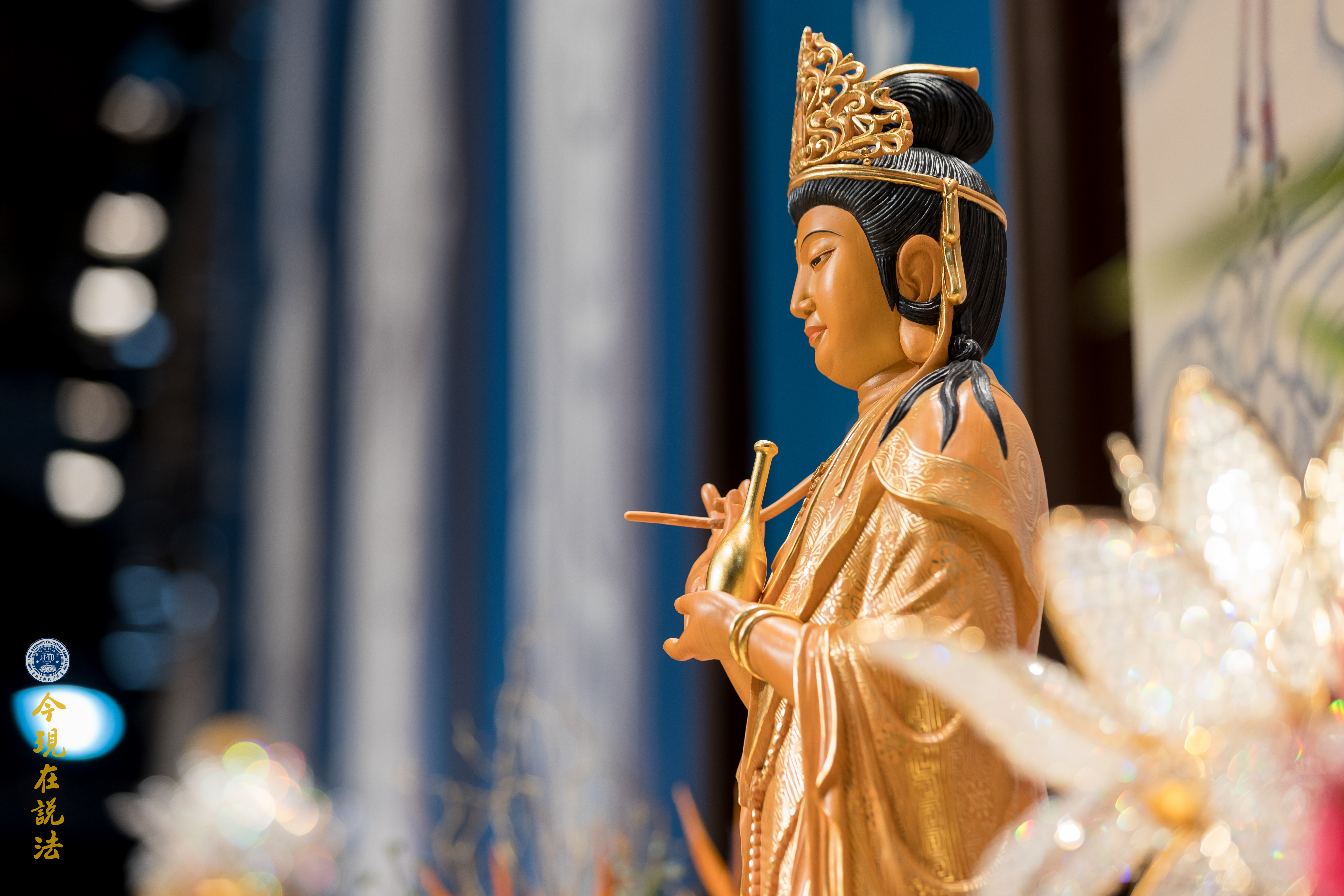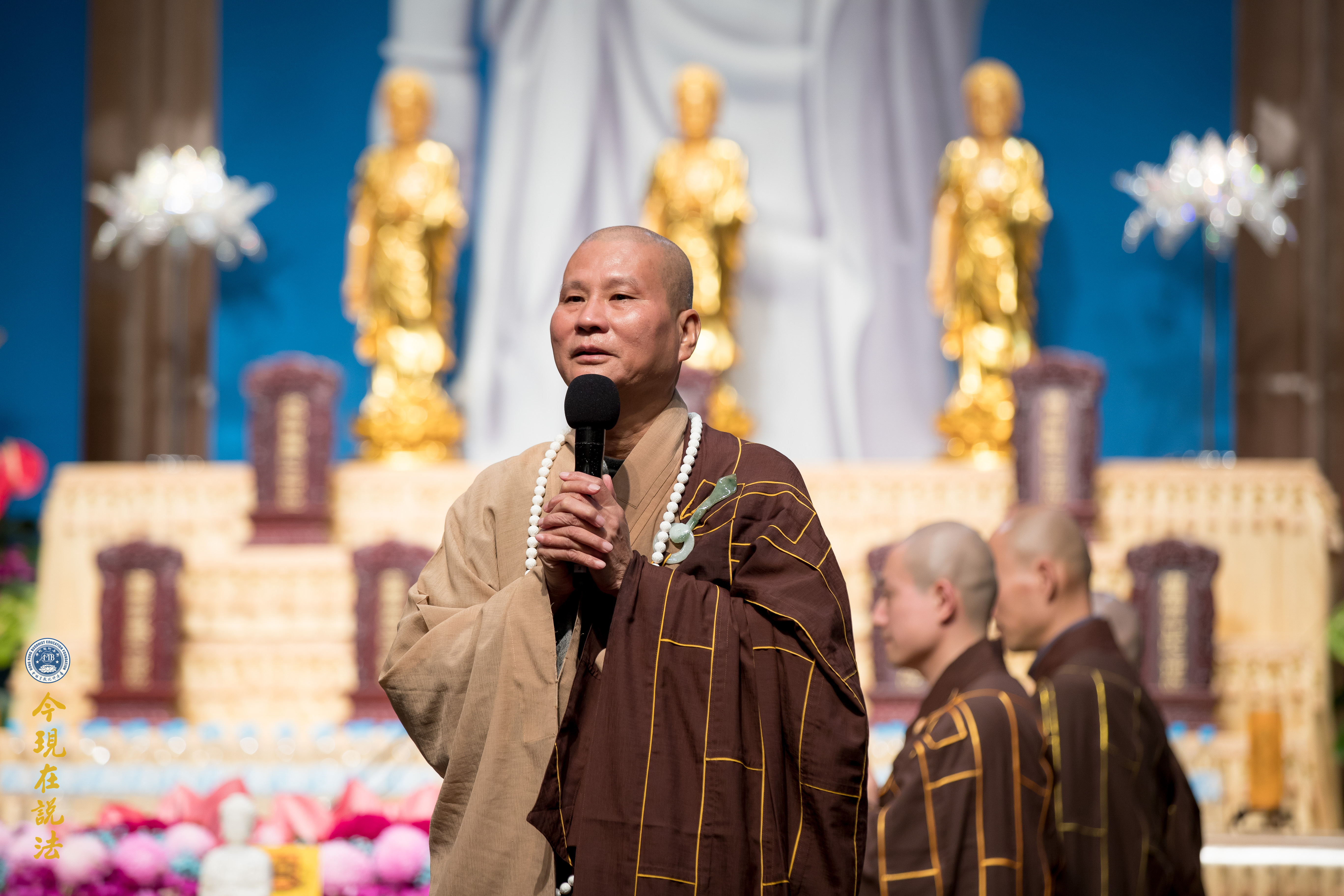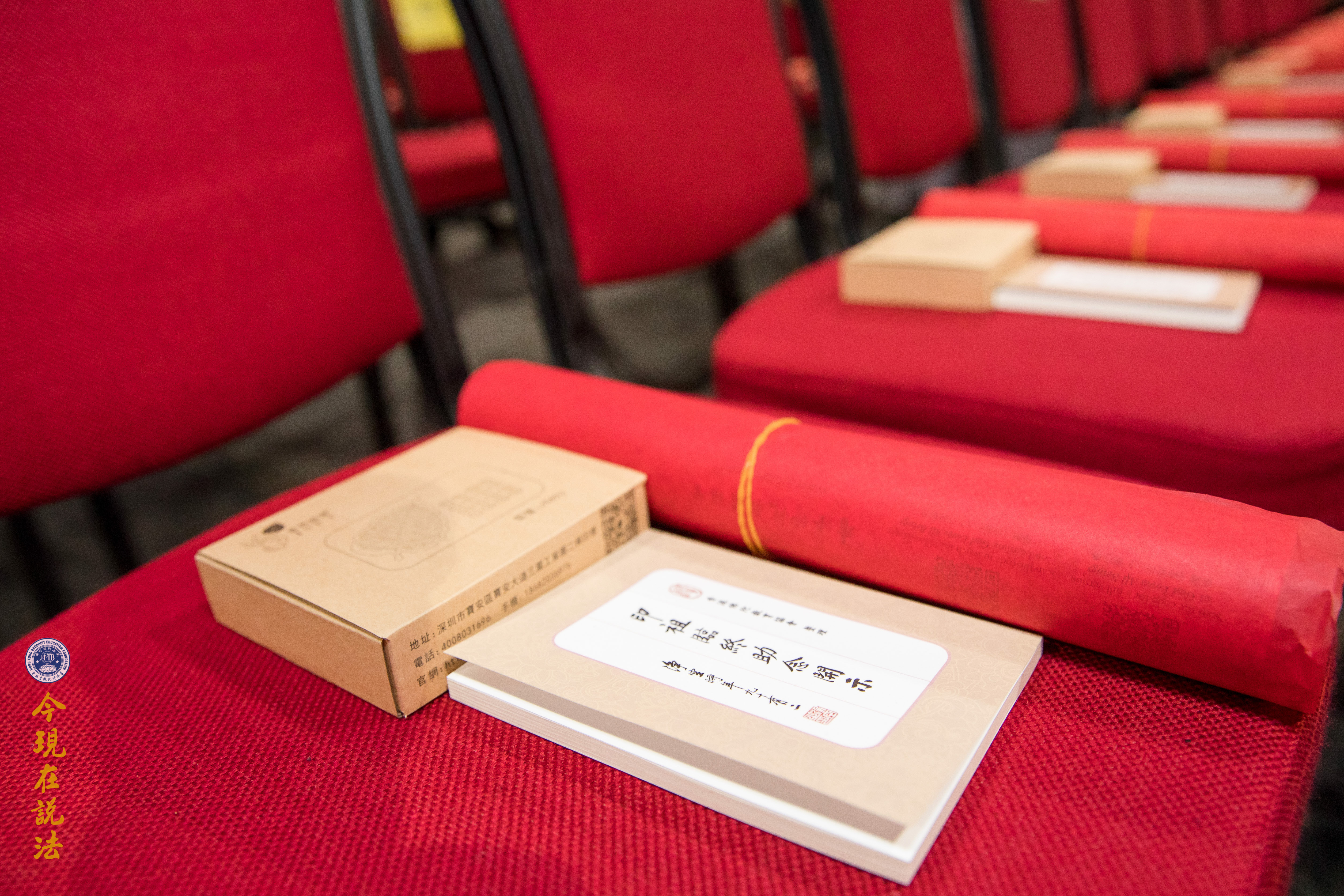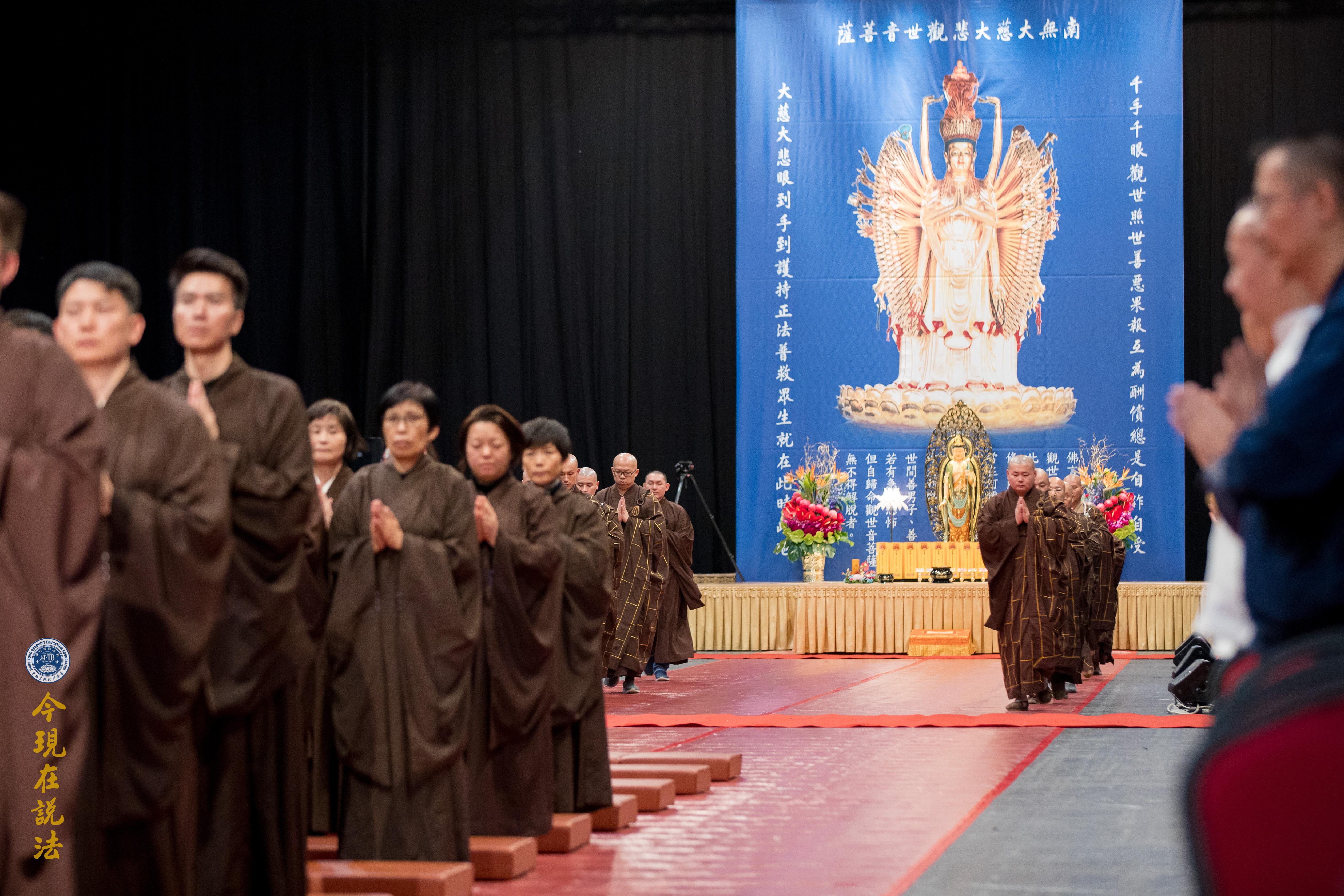 會場懸掛巨幅佛像,莊嚴肅穆。