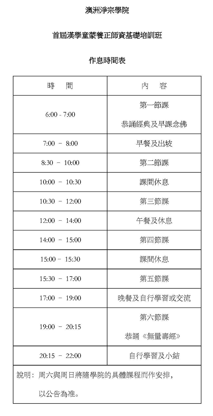 首屆漢學童蒙養正師資基礎培訓班作息時間表