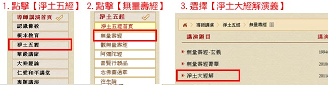 b.進入「導師講演」欄目,左側欄目導航處點擊「淨土五經」,彈出下拉列表,點擊「無量壽經」,然後在右側欄目列表處,點擊「淨土大經解演義」,就進入「淨土大經解演義」全部列表。