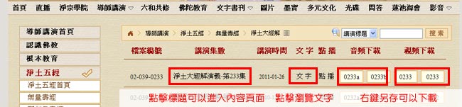 c.您可以點擊標題「淨土大經解演義-第233集」進入內容頁,或點擊「點播」;如果文字處顯示「文字」說明已經有字幕文稿,如果顯示「暫無」說明暫時沒有字幕文稿;下載處可以下載64k聲音檔或170k視頻檔(此處是從中國電信下載),如果您需要點播或下載其他格式檔案,以及選擇不同服務器下載,請點擊「淨土大經解演義-第233集」進入內容頁,然後操作,操作方法請點「講演影音點播」「講演影音下載」。